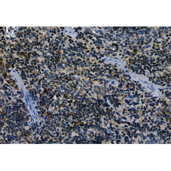 ab12136 at 1/100 staining Mouse spleen tissue by IHC-P. The sample was formaldehyde fixed and a heat mediated antigen retrieval step in citrate buffer was performed. The sample was then blocked and incubated with the primary antibody at 4°C overnight. An HRP conjugated anti-Rabbit antibody was used as the secondary antibody....