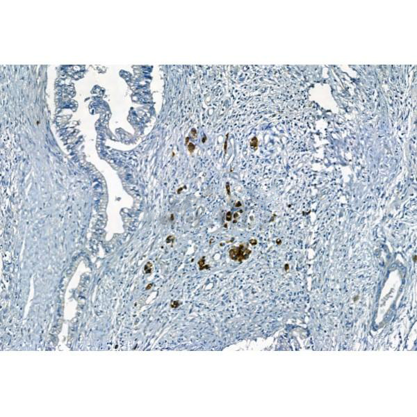 ab12136 at 1/100 staining Human pancreatic cancer by IHC-P. The sample was formaldehyde fixed and a heat mediated antigen retrieval step in citrate buffer was performed. The sample was then blocked and incubated with the primary antibody at 4°C overnight. An HRP conjugated anti-Rabbit antibody was used as the secondary antibody....