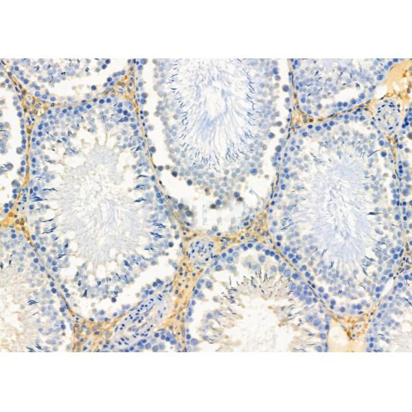 ab14646 at 1/100 staining Rat testis tissue by IHC-P. The sample was formaldehyde fixed and a heat mediated antigen retrieval step in citrate buffer was performed. The sample was then blocked and incubated with the primary antibody at 4°C overnight. An HRP conjugated anti-Rabbit antibody was used as the secondary antibody....