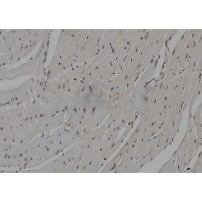 ab16084 at 1/100 staining Mouse heart tissue by IHC-P. The sample was formaldehyde fixed and a heat mediated antigen retrieval step in citrate buffer was performed. The sample was then blocked and incubated with the antibody for 1.5 hours at 22°C. An HRP conjugated goat anti-rabbit antibody was used as the secondary antibody....