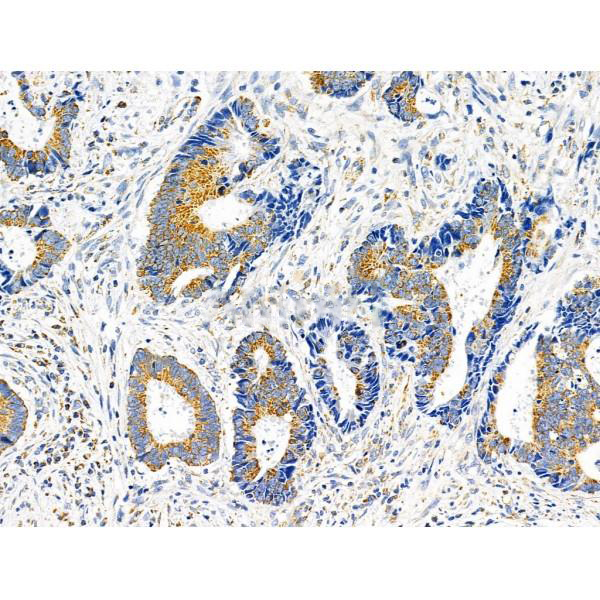 ab14842 at 1/100 staining Human colorectal cancer by IHC-P. The sample was formaldehyde fixed and a heat mediated antigen retrieval step in citrate buffer was performed. The sample was then blocked and incubated with the primary antibody at 4°C overnight. An HRP conjugated anti-Rabbit antibody was used as the secondary antibody....