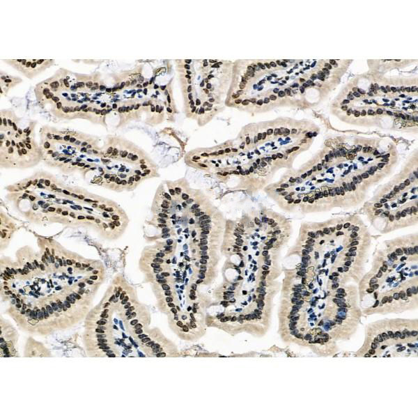 ab13243 at 1/100 staining Mouse colorectal tissue by IHC-P. The sample was formaldehyde fixed and a heat mediated antigen retrieval step in citrate buffer was performed. The sample was then blocked and incubated with the primary antibody at 4°C overnight. An HRP conjugated anti-Rabbit antibody was used as the secondary antibody....