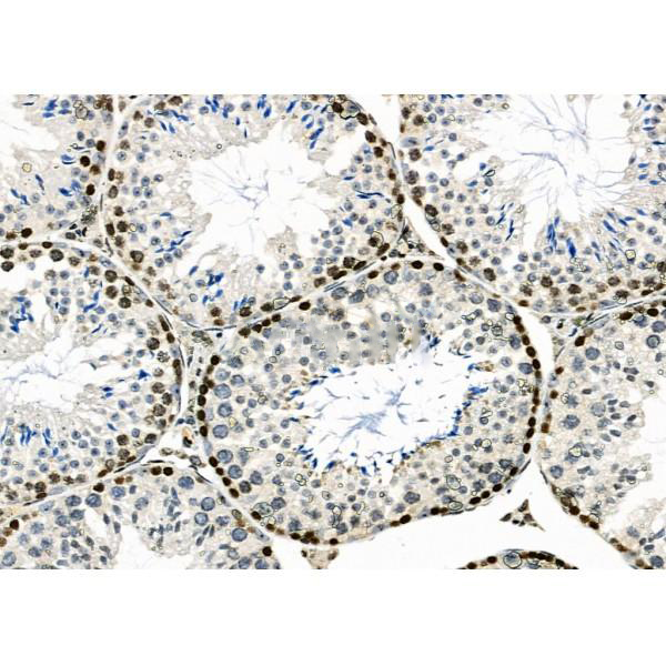 ab13243 at 1/100 staining Mouse testis tissue by IHC-P. The sample was formaldehyde fixed and a heat mediated antigen retrieval step in citrate buffer was performed. The sample was then blocked and incubated with the primary antibody at 4°C overnight. An HRP conjugated anti-Rabbit antibody was used as the secondary antibody....