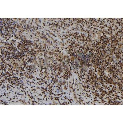 ab13243 at 1/100 staining Human spleen tissue by IHC-P. The sample was formaldehyde fixed and a heat mediated antigen retrieval step in citrate buffer was performed. The sample was then blocked and incubated with the antibody for 1.5 hours at 22°C. An HRP conjugated goat anti-rabbit antibody was used as the secondary antibody....