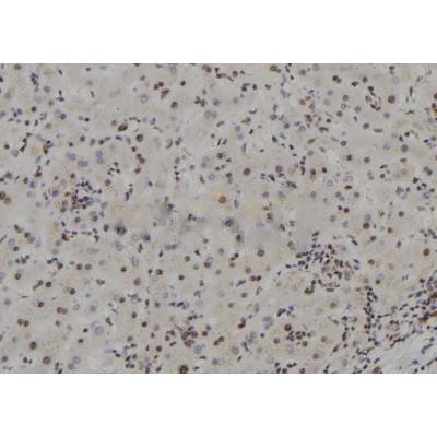 ab17384 at 1/100 staining Human liver tissue by IHC-P. The sample was formaldehyde fixed and a heat mediated antigen retrieval step in citrate buffer was performed. The sample was then blocked and incubated with the antibody for 1.5 hours at 22°C. An HRP conjugated goat anti-rabbit antibody was used as the secondary antibody....