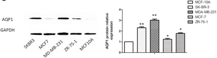 FIGURE 1 | The miR-3194-3p and AQP1 expression levels in BC tissues and cell lines. Comparing differences in the expression levels of miR-3194-3p between(A) BC and adjacent non-tumor tissues (n = 30); (B) BC cell lines and the control breast epithelial cells (MCF-10A); differences in AQP1 mRNA level between (C) BC and adjacent non-tumor tissue; (D) BC cell lines and MCF-10A; differences in AQP1 protein level between (E) BC cell lines and MCF-10A....