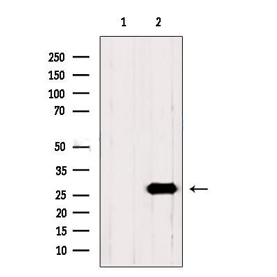 Western blot analysis of extracts from Hela, using AQP1 Antibody. The lane on the left was treated with blocking peptide....
