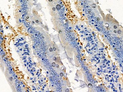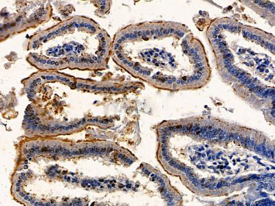 ab17620 at 1/100 staining mouse colorectal tissue by IHC-P. The sample was formaldehyde fixed and a heat mediated antigen retrieval step in citrate buffer was performed. The sample was then blocked and incubated with the primary antibody at 4°C overnight. An HRP conjugated anti-rabbit antibody was used as the secondary antibody....