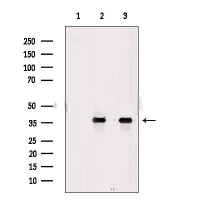 Western blot analysis of extracts from various samples, using Aquaporin 7 Antibody. Lane 1: EC304 cells, treated with blocking peptide; Lane 2: EC304 cells; Lane 3: P19 cells....
