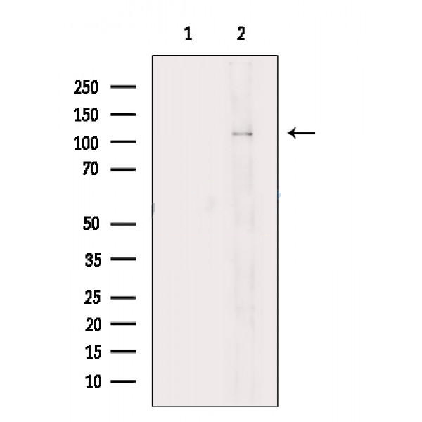 Western blot analysis of extracts from Hela cells, using AR Antibody. The lane on the left was treated with blocking peptide....
