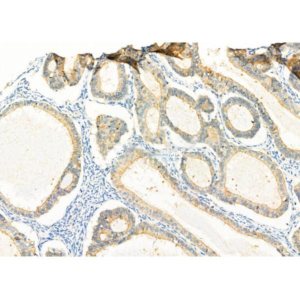 ab16722 at 1/100 staining Human ovarian cancer by IHC-P. The sample was formaldehyde fixed and a heat mediated antigen retrieval step in citrate buffer was performed. The sample was then blocked and incubated with the primary antibody at 4°C overnight. An HRP conjugated anti-Rabbit antibody was used as the secondary antibody....