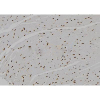 ab16722 at 1/100 staining Rat heart tissue by IHC-P. The sample was formaldehyde fixed and a heat mediated antigen retrieval step in citrate buffer was performed. The sample was then blocked and incubated with the antibody for 1.5 hours at 22°C. An HRP conjugated goat anti-rabbit antibody was used as the secondary antibody....