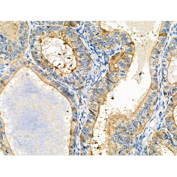 ab16232 at 1/100 staining Human kidney cancer by IHC-P. The sample was formaldehyde fixed and a heat mediated antigen retrieval step in citrate buffer was performed. The sample was then blocked and incubated with the primary antibody at 4°C overnight. An HRP conjugated anti-Rabbit antibody was used as the secondary antibody....