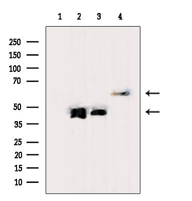 Western blot analysis of extracts from various samples, using ARFGAP1 Antibody. Lane 1: Rat liver, blocked with antigen-specific peptides. Lane 2: Rat liver. Lane 3: Mouse brain在45左右. Lane 4: Hepg2 cells(heat-shock treatment)....