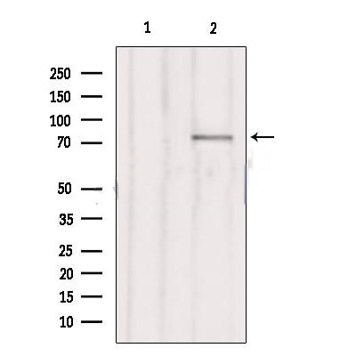 Western blot analysis of extracts from Hepg2, using RHG25 Antibody. Lane 1 was treated with the blocking peptide....