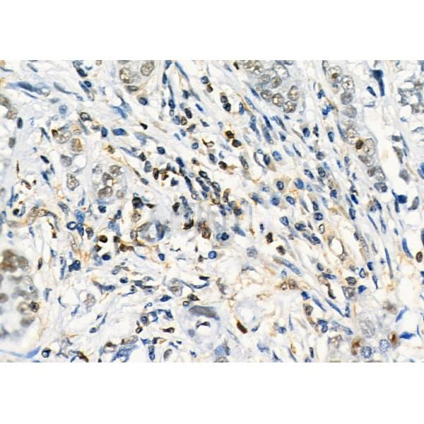 ab12970 at 1/100 staining Human gastric cancer by IHC-P. The sample was formaldehyde fixed and a heat mediated antigen retrieval step in citrate buffer was performed. The sample was then blocked and incubated with the primary antibody at 4°C overnight. An HRP conjugated anti-Rabbit antibody was used as the secondary antibody....