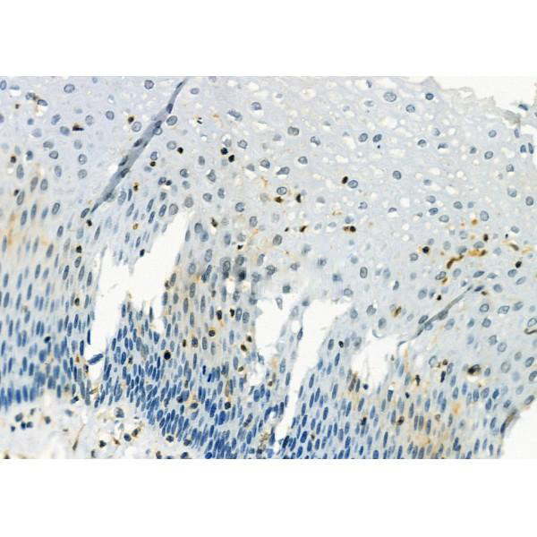 ab12970 at 1/100 staining Human esophageal cancer and adjacent normal tissues by IHC-P. The sample was formaldehyde fixed and a heat mediated antigen retrieval step in citrate buffer was performed. The sample was then blocked and incubated with the primary antibody at 4°C overnight. An HRP conjugated anti-Rabbit antibody was used as the secondary antibody....