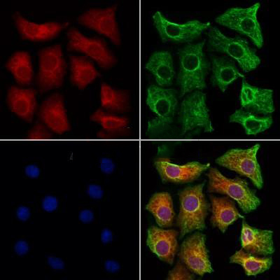 ab12970 staining Hela cells by IF/ICC. The samples were fixed with PFA and permeabilized in 0.1% Triton X-100,then blocked in 10% serum for 45 minutes at 25°C. Samples were then incubated with primary Ab(ab12970 1:200) and mouse anti-beta tubulin for 1 hour at 37°C. An AlexaFluor594 conjugated goat anti-rabbit IgG(H+L) Ab(Red) and an AlexaFluor488 conjugated goat anti-mouse IgG(H+L) Ab(Green) were used as the secondary antibody. The nuclear counter stain is DAPI(blue)....