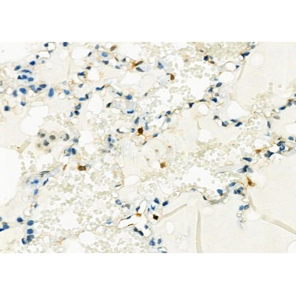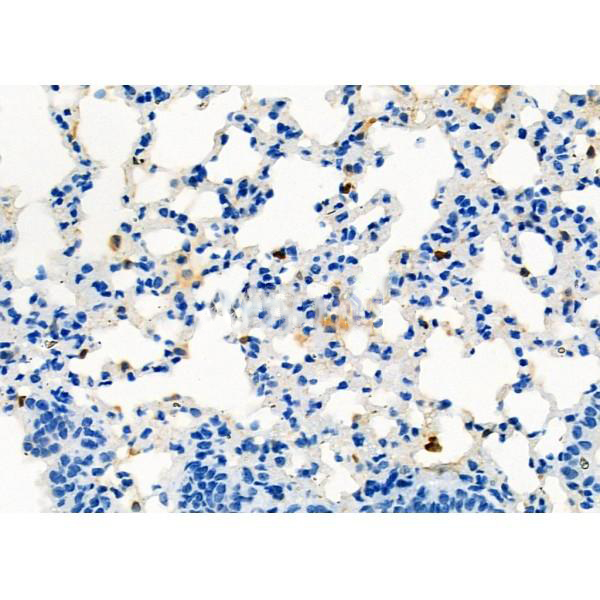 ab12970 at 1/100 staining Mouse lung tissue by IHC-P. The sample was formaldehyde fixed and a heat mediated antigen retrieval step in citrate buffer was performed. The sample was then blocked and incubated with the primary antibody at 4°C overnight. An HRP conjugated anti-Rabbit antibody was used as the secondary antibody....