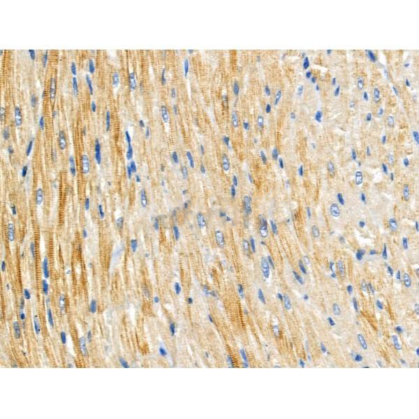 ab14608 at 1/100 staining Rat heart tissue by IHC-P. The sample was formaldehyde fixed and a heat mediated antigen retrieval step in citrate buffer was performed. The sample was then blocked and incubated with the primary antibody at 4°C overnight. An HRP conjugated anti-Rabbit antibody was used as the secondary antibody....
