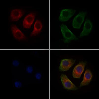 ab12141 staining Hela cells by IF/ICC. The samples were fixed with PFA and permeabilized in 0.1% Triton X-100,then blocked in 10% serum for 45 minutes at 25°C. Samples were then incubated with primary Ab(ab12141 1:200) and mouse anti-beta tubulin for 1 hour at 37°C. An AlexaFluor594 conjugated goat anti-rabbit IgG(H+L) Ab(Red) and an AlexaFluor488 conjugated goat anti-mouse IgG(H+L) Ab(Green) were used as the secondary antibody. The nuclear counter stain is DAPI(blue)....