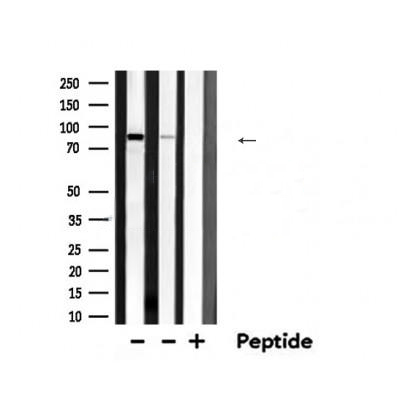Western blot analysis of extracts from various samples, using ARNT Antibody. Lane 1: Rat brain lysates; Lane 2: Mouse brain lysates; Lane 3: Mouse brain lysates treated with blocking peptide;...