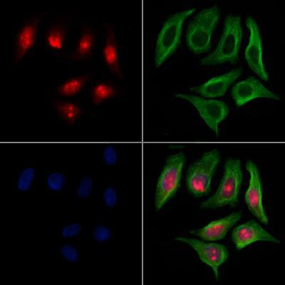 ab16216 staining Hela cells by IF/ICC. The samples were fixed with PFA and permeabilized in 0.1% Triton X-100,then blocked in 10% serum for 45 minutes at 25°C. Samples were then incubated with primary Ab(ab16216 1:200) and mouse anti-beta tubulin for 1 hour at 37°C. An AlexaFluor594 conjugated goat anti-rabbit IgG(H+L) Ab(Red) and an AlexaFluor488 conjugated goat anti-mouse IgG(H+L) Ab(Green) were used as the secondary antibody. The nuclear counter stain is DAPI(blue)....