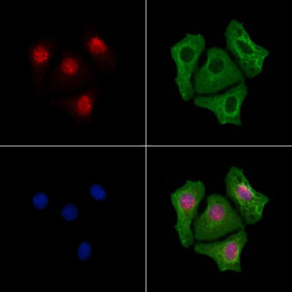 ab12142 staining Hela cells by IF/ICC. The samples were fixed with PFA and permeabilized in 0.1% Triton X-100,then blocked in 10% serum for 45 minutes at 25°C. Samples were then incubated with primary Ab(ab12142) and mouse anti-beta tubulin for 1 hour at 37°C. An AlexaFluor594 conjugated goat anti-rabbit IgG(H+L) Ab(Red) and an AlexaFluor488 conjugated goat anti-mouse IgG(H+L) Ab(Green) were used as the secondary antibody. The nuclear counter stain is DAPI (blue)....