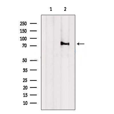 Western blot analysis of extracts from 293t, using ARPP21 Antibody. The lane on the left was treated with blocking peptide....