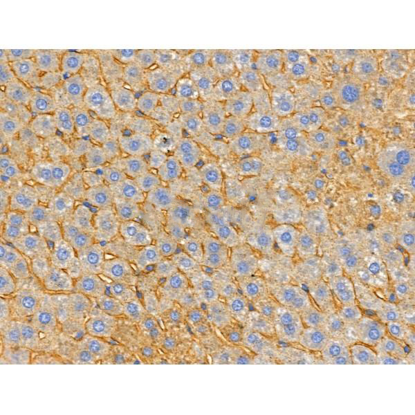 ab14376 at 1/100 staining Mouse liver tissue by IHC-P. The sample was formaldehyde fixed and a heat mediated antigen retrieval step in citrate buffer was performed. The sample was then blocked and incubated with the primary antibody at 4°C overnight. An HRP conjugated anti-Rabbit antibody was used as the secondary antibody....