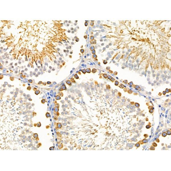 ab14376 at 1/100 staining Rat testis tissue by IHC-P. The sample was formaldehyde fixed and a heat mediated antigen retrieval step in citrate buffer was performed. The sample was then blocked and incubated with the primary antibody at 4°C overnight. An HRP conjugated anti-Rabbit antibody was used as the secondary antibody....