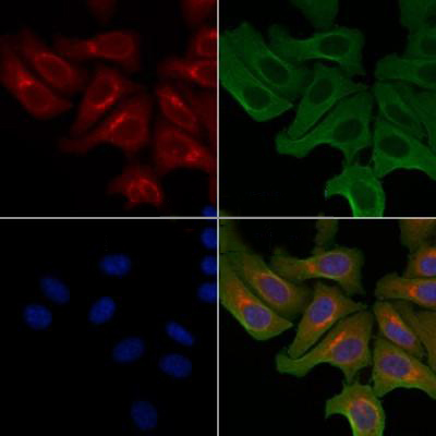 ab14654 staining Hela cells by IF/ICC. The samples were fixed with PFA and permeabilized in 0.1% Triton X-100,then blocked in 10% serum for 45 minutes at 25°C. Samples were then incubated with primary Ab(ab14654) and mouse anti-beta tubulin for 1 hour at 37°C. An AlexaFluor594 conjugated goat anti-rabbit IgG(H+L) Ab(Red) and an AlexaFluor488 conjugated goat anti-mouse IgG(H+L) Ab(Green) were used as the secondary antibody. The nuclear counter stain is DAPI(blue)....