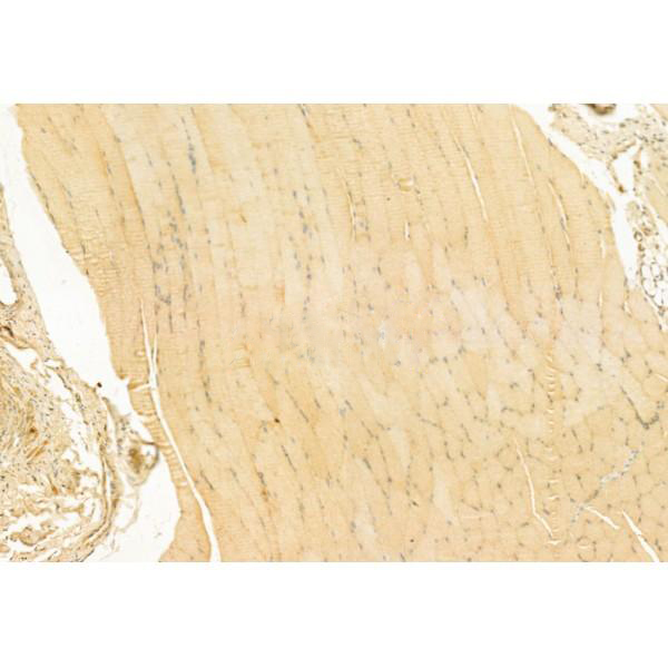ab11649 at 1/100 staining Rat muscle tissue by IHC-P. The sample was formaldehyde fixed and a heat mediated antigen retrieval step in citrate buffer was performed. The sample was then blocked and incubated with the primary antibody at 4°C overnight. An HRP conjugated anti-Rabbit antibody was used as the secondary antibody....