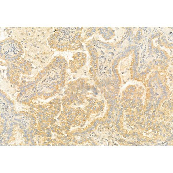 ab11649 at 1/100 staining Human lung cancer by IHC-P. The sample was formaldehyde fixed and a heat mediated antigen retrieval step in citrate buffer was performed. The sample was then blocked and incubated with the primary antibody at 4°C overnight. An HRP conjugated anti-Rabbit antibody was used as the secondary antibody....