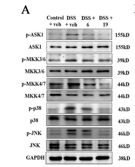 Fig. 6. Inhibitory effect of compounds 19 and 6 on activated ASK1-p38/JNK signaling and up-regulated inflammatory cytokines in colon tissues of DSS-induced UC mice. (A) Western blot analysis of the protein levels of ASK1-MKK3/6-p38 and ASK1-MKK4/7-JNK signaling pathways as well as corresponding phosphorylated proteins. GAPDH was used as the loading control protein. (B) Quantitative analysis of the ratios of phosphorylated proteins normalized to their unphosphorylated form. (C) The levels of inflammatory cytokines IL-1b, IL-6, TNF-a were detected using ELISA kits. Data are expressed as mean ± SEM (n ¼ 5e6 per group). Compared with the control group: # P < 0.05, ## P < 0.01, ### P < 0.001; Compared with the DSS þ Veh group: * P < 0.05, ** P < 0.01, *** P < 0.001....