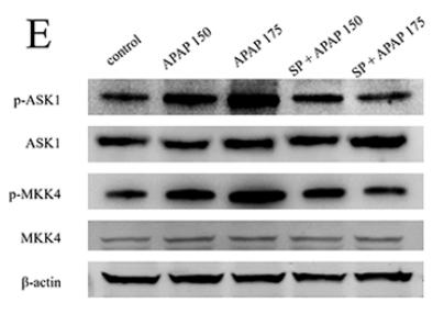 FIGURE 2 | Activation of JNK signaling pathway under different dosages of APAP.(E) Western blot analyses of total tissue lysate for p-ASK1, ASK1, p-MKK4, MKK4, and β-actin (loading control). Values represented as means ± SD, n = 3. *Represents statistical differences caused by APAP. #Represents statistical differences caused by SP600125 under 150 mg·kg−1 APAP;§Represents statistical differences caused by SP600125 under 175 mg·kg−1 APAP. 0.05 > P > 0.01 (*, #, §). P < 0.01 (**, §§)....