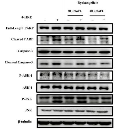 FIGURE 5|Byakangelicin inhibits 4-HNE–induced hepatocyte apoptosis by inhibiting ASK1/JNK pathway. D and E, Protein full-length PARP, PARP, cleaved caspase-3, caspase-3, JNK, P-JNK, ASK-1 and P-ASK-1 were also detected and quantified using Western blot analyses....