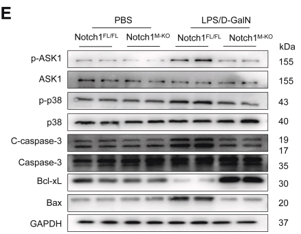Figure 3 Myeloid-specific deletion of Notch1 alleviates LPS/D-GalN-induced hepatocellular apoptosis. (A) Representative TUNEL staining images and quantification of TUNEL+ cells in liver sections from the Notch1FL/FL and Notch1M-KO mice treated with PBS or LPS/D-GalN injection (n = 5 mice/group). Scale bars, 20 μm. (B) Immunohistochemistry staining and quantification of cleaved caspase-3 (C-caspase-3) positive cells in liver sections (n = 5 mice/group). Scale bars, 40 μm. ELISA analysis of serum TNF-α (C) and HMGB1 (D) levels in the Notch1FL/FL and Notch1M-KO mice (n = 5 samples/group). (E) Western blot analysis and relative density ratio of p-ASK1, ASK1, p-p38, p38, C-caspase-3, caspase-3, Bcl-xL, and Bax in the Notch1FL/FL and Notch1M-KO livers. Data are presented as the mean ± standard deviation. ∗P < .05, ∗∗P < .01....