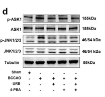 Fig. 5 Effects of 4-PBA and URB597 on TRAF2/ASK/JNK signaling. a Representative images of p-ASK1 (green) immunofluorescence. b Statistical analysis of the relative fluorescence intensity. c Co-IP experiment between TRAF2 and ASK1. d Representative Western blots of the ASK/JNK signaling-related proteins ASK1, p-ASK1, JNK1/2/3, and p-JNK1/2/3. e, f Relative protein expression levels. *P ...
