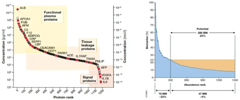图1(左) 血液中不同丰度蛋白的浓度和排名分布;(右) 血液中已发现的biomarker的排名分布