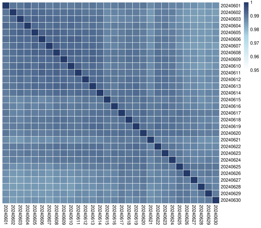 根据我们的最新内部测试,质谱仪器在连续运行一个月,通过Pearson相关性热图显示,所有样本间的相关性≥0.98,这充分证明了基于质谱的高深度血液蛋白组学分析上千例血液样本的高稳定性。